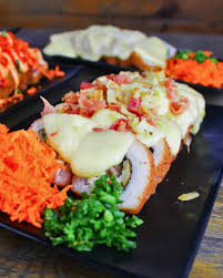 Topped with: mozzarella, tempura shrimp, unagi sauce & chipotle.