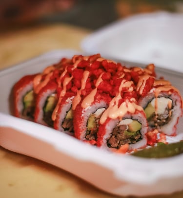 TOPPED WITH: UNAGI SAUCE & CHIPOTLE.